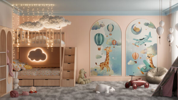 Utrzymana w pastelowych odcieniach błękitu i bieli, naklejka wprowadza do dziecięcego pokoju atmosferę spokoju, marzeń i lekkości. Idealna dla małych marzycieli i odkrywców, którzy każdego dnia chcą sięgać wyżej. To nie tylko dekoracja – to mały kawałek nieba, który inspiruje do wielkich przygód!